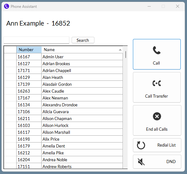 Once the Phone Assistant app is opened it will show options for using the connected phone. You can search the address book, place calls, transfer calls, end calls, access the redial list on the phone and set do not disturb.